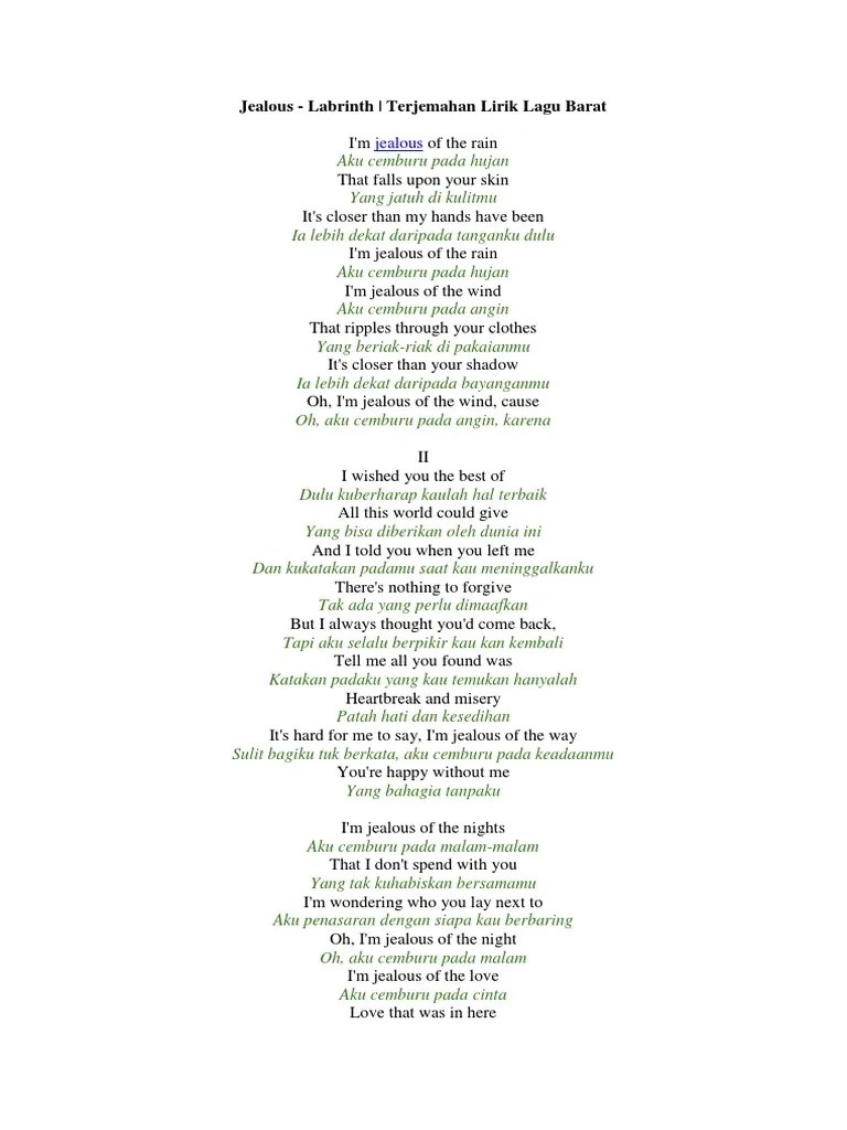 It's hard for me to say, i'm jealous of the way. Download lagu labrinth jealous cover by alexandra porat lyrics dan streaming kumpulan lagu labrinth jealous cover by alexandra porat lyrics mp3 terbaru di . Download lagu jealous labrinth (4.47 m) mp3 secara gratis hanya di dunialagu. Hallo hope this lyrics can make you feel better.maaf jika ada salah dalam pengartian.lagu apa lagi nih yang pas dibuat lirik videonya? List download link lagu mp3 labrinth jealous mp3 gratis and free streaming terbaru. That falls upon your skin. I'm jealous of the rain. Layanan mobile dari situs entertainment terbesar indonesia, kapanlagi.com. Lirik lagu ini mengingatkan aku padanya, mudya, aku takkan pernah melupakan mu.